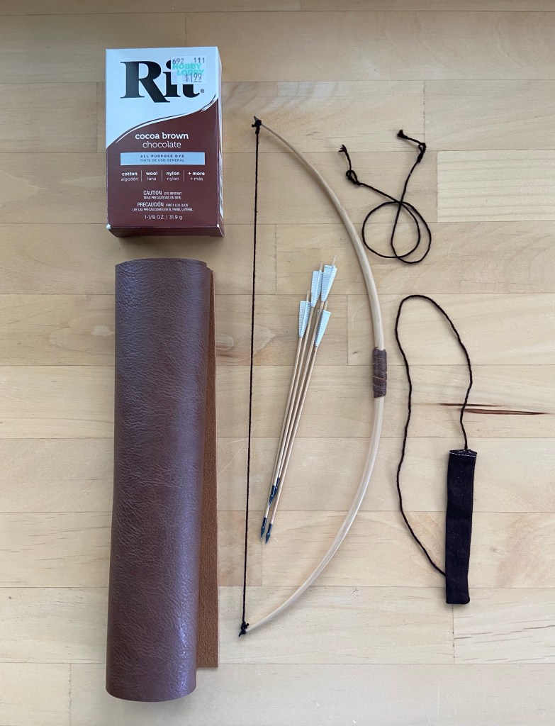 I wrapped and glued a 1/8” strip of thin leather to fashion a grip for the bow. And I dyed the bowstrings and the quiver.