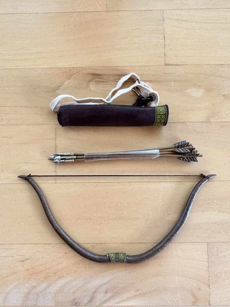 It’s a bit small for a shortbow, though. Medieval shortbows were typically about 3 feet in length. This bow is 5 3/8” in length which at 1/6 scale translates to 32 1/4” in 1:1 scale. The arrows are 4” so they’d be 2 feet long. Anyway it’s on the small side.